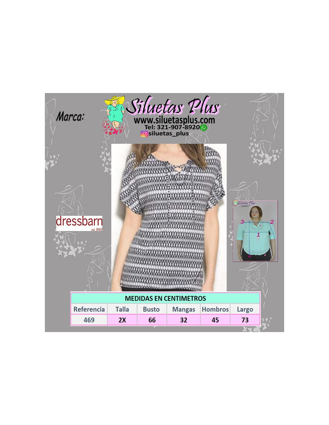 Preciosa blusa para mujer talla grande, gordita, marca Dressbarn, tonos blanco y negro, manga corta, cordón de ajuste en el pecho y cuello en V. Gracias a su posibilidad de ajuste pensado en mujeres curvy y plus size se puede conseguir una silueta perfecta a tu comodidad y estética. La prenda resulta ideal para ocasiones casuales en el diario