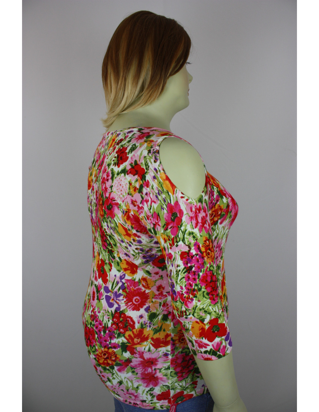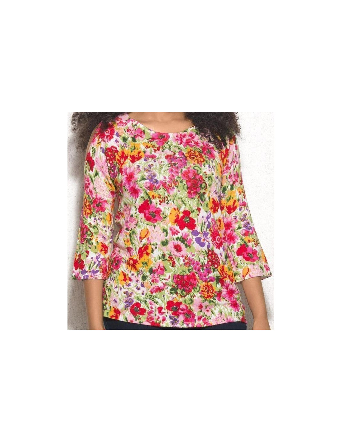 Hermoso saco para mujer talla grande, gordita, diseño de flores de varios colores, manga tres cuarto y cuello redondo, detalle de abertura en los hombros. Diseñado especialmente en talla grande para mujeres curvy y plus size en Colombia que deseen una imagen muy femenina y segura durante todo el día. Arma tu propio look combinándolo con otras prendas