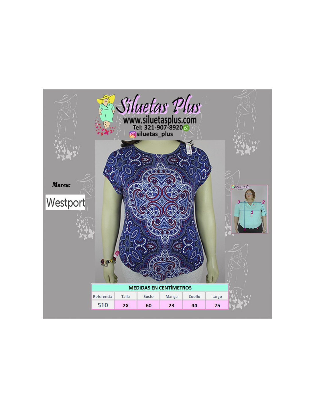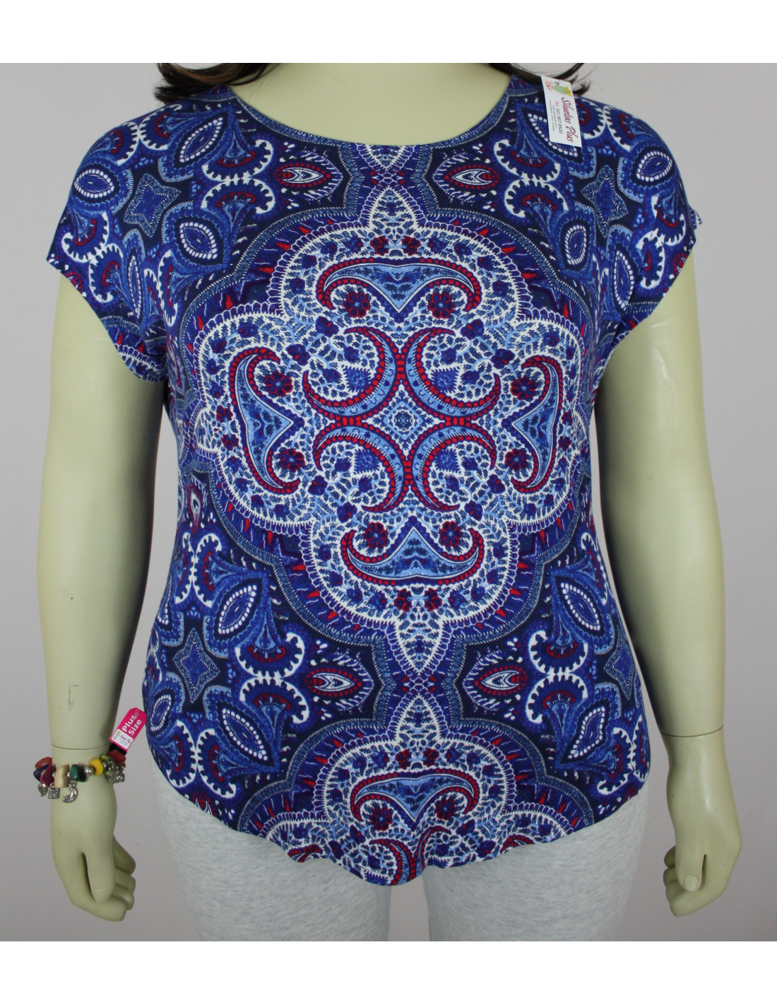 Elegante blusa marca Wesport en tonos fuertes y vivos, diseño de mándalas, con cuello redondo y manga corta. Especialmente diseñada en talla grande para mujeres gorditas, es súper confortable, y se adapta muy bien a tu cuerpo para que sientas máxima frescura y tengas una apariencia relajada y agradable durante todo el día