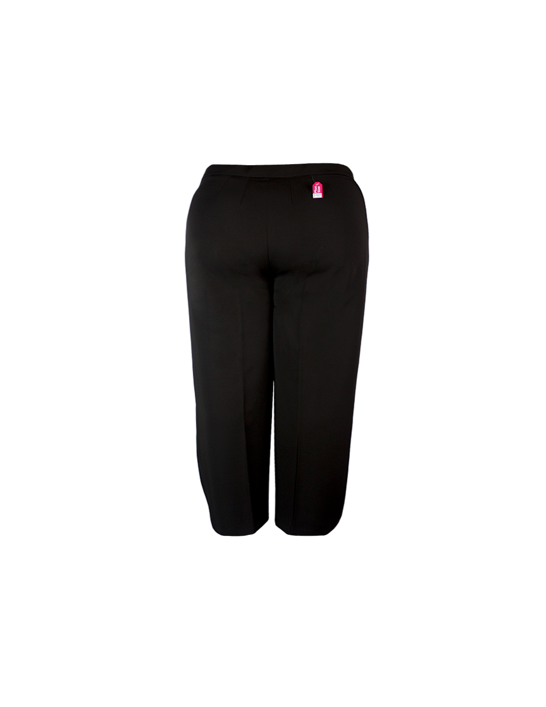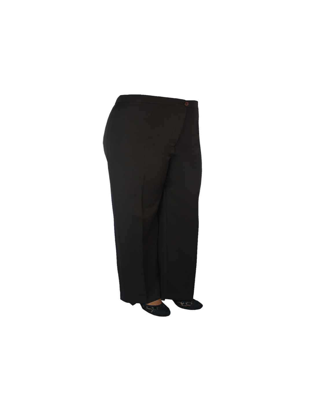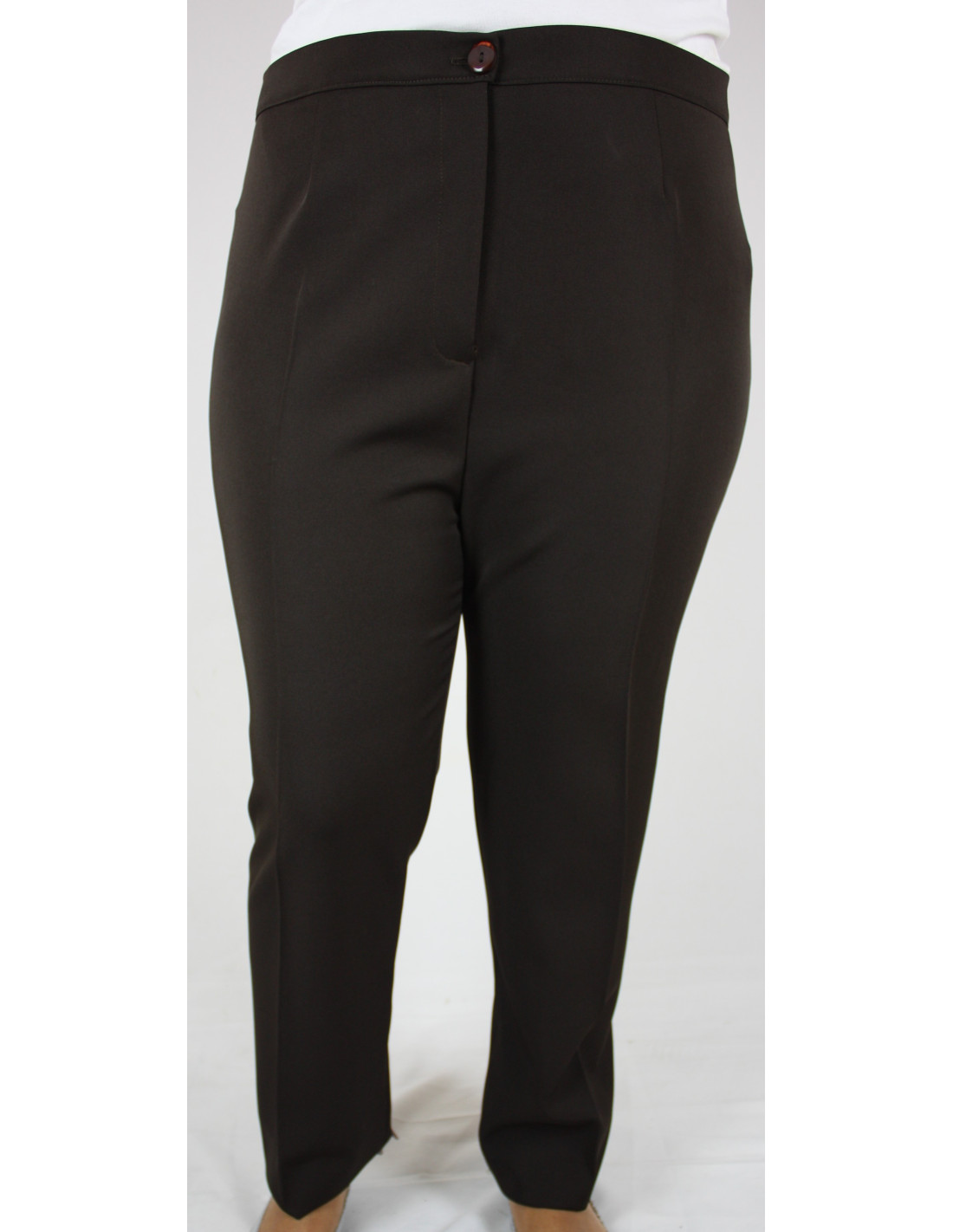 Elegante pantalón para mujer talla grande, gordita en Colombia, color café, bota recta, cadera ajustable, cierre de cremallera y botón. Apto para ocasiones casuales o formales. Su figura refleja confort, seguridad y elegancia debido a diseño para mujeres curvy y plus size. Al sentir al tacto su textura se puede percibir una sensación de comodidad