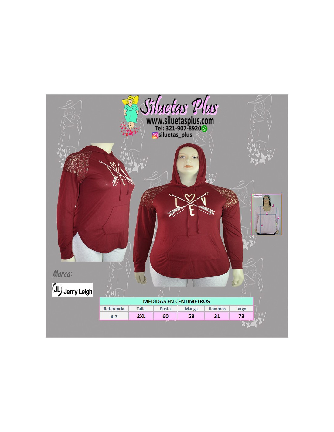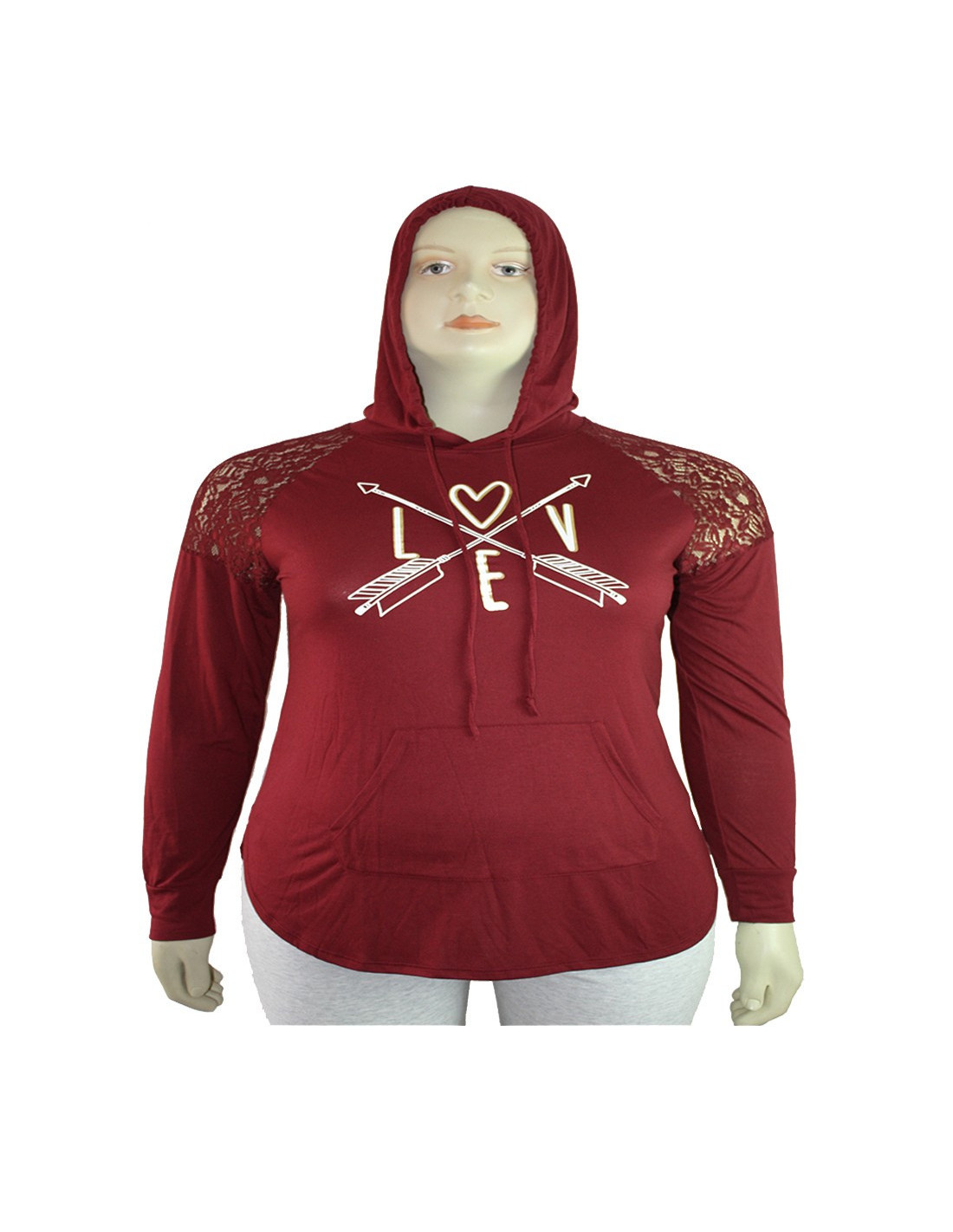 Hermoso buso importado para mujer talla grande, gordita, marca Jerry Leigh, color vinotinto, capota, diseño especial de encaje en los hombros y estampado love en el pecho, manga larga ideal para un look casual, perfecta para mujeres curvy y plus size que encuentran un estilo original, juvenil y a la moda al adquirir esta preciosa prenda