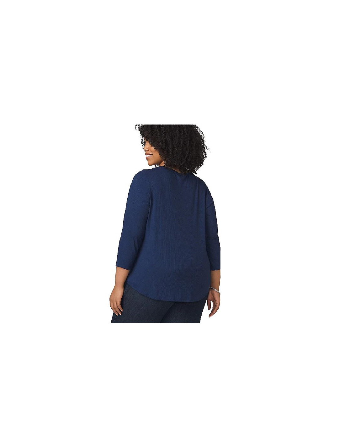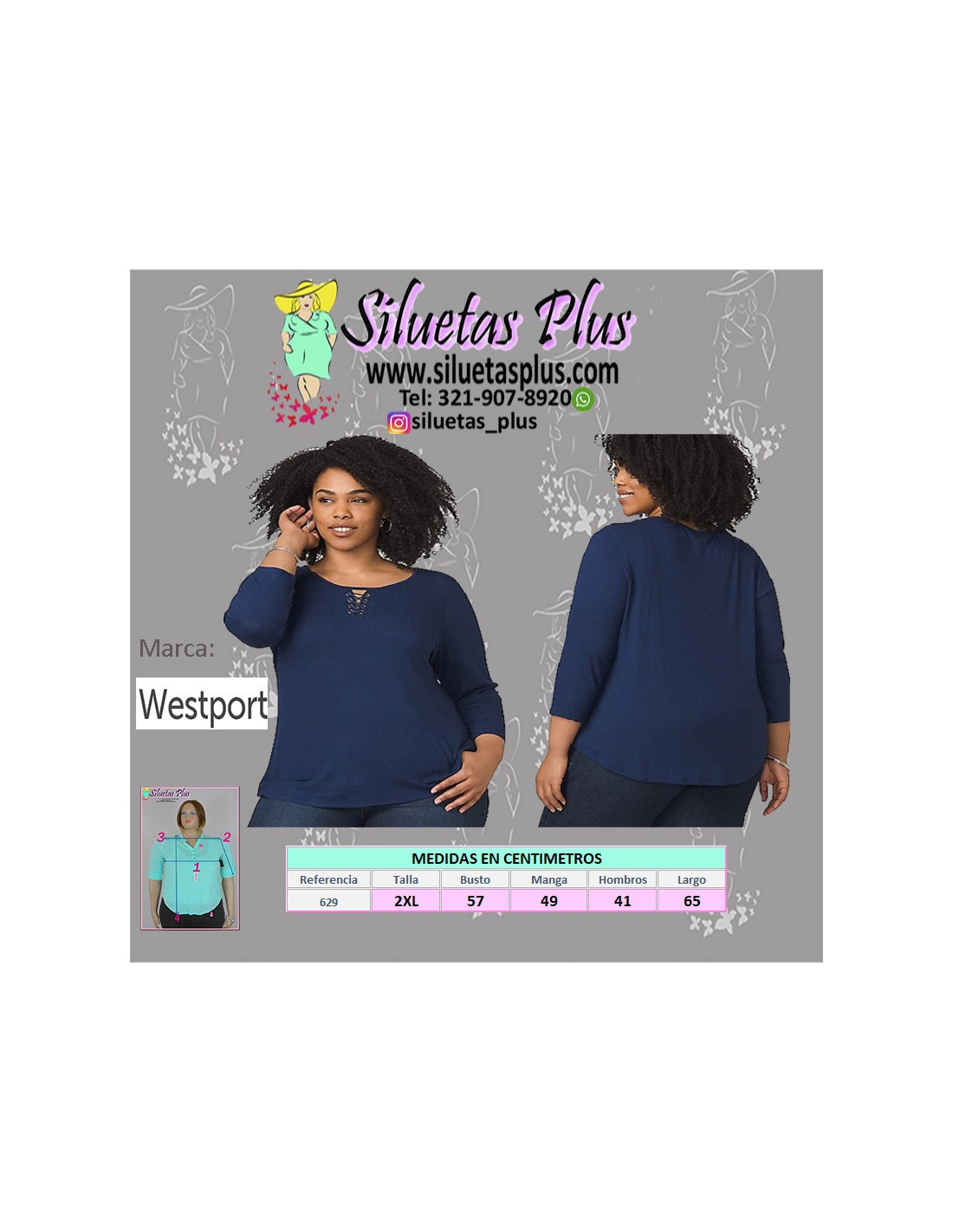 Linda blusa para mujer talla grande, gordita, azul oscura, marca Westport que te brinda un look casual y muy femenino, tiene manga tres cuartos y un cordón en la zona del cuello. Su silueta semi-ajustada es perfecta para mujeres curvy y plus size, encantadoras que buscan un prenda cómoda y fresca para su figura femenina y sofisticada