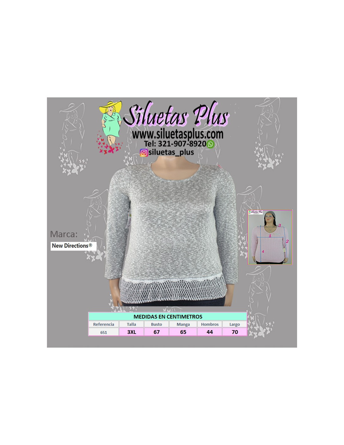 Lindo saco para mujer talla grande, gordita, marca New Directions, tonos grises, manga larga, detalle en la parte baja en colores blanco y negro, perfecto para cualquier ocasión. Gracias a su tela suave y cómoda siente todo el confort necesario para tu día a día. Su diseño resulta ideal para mujeres curvy y plus size que desean reflejar un look descomplicado y moderno