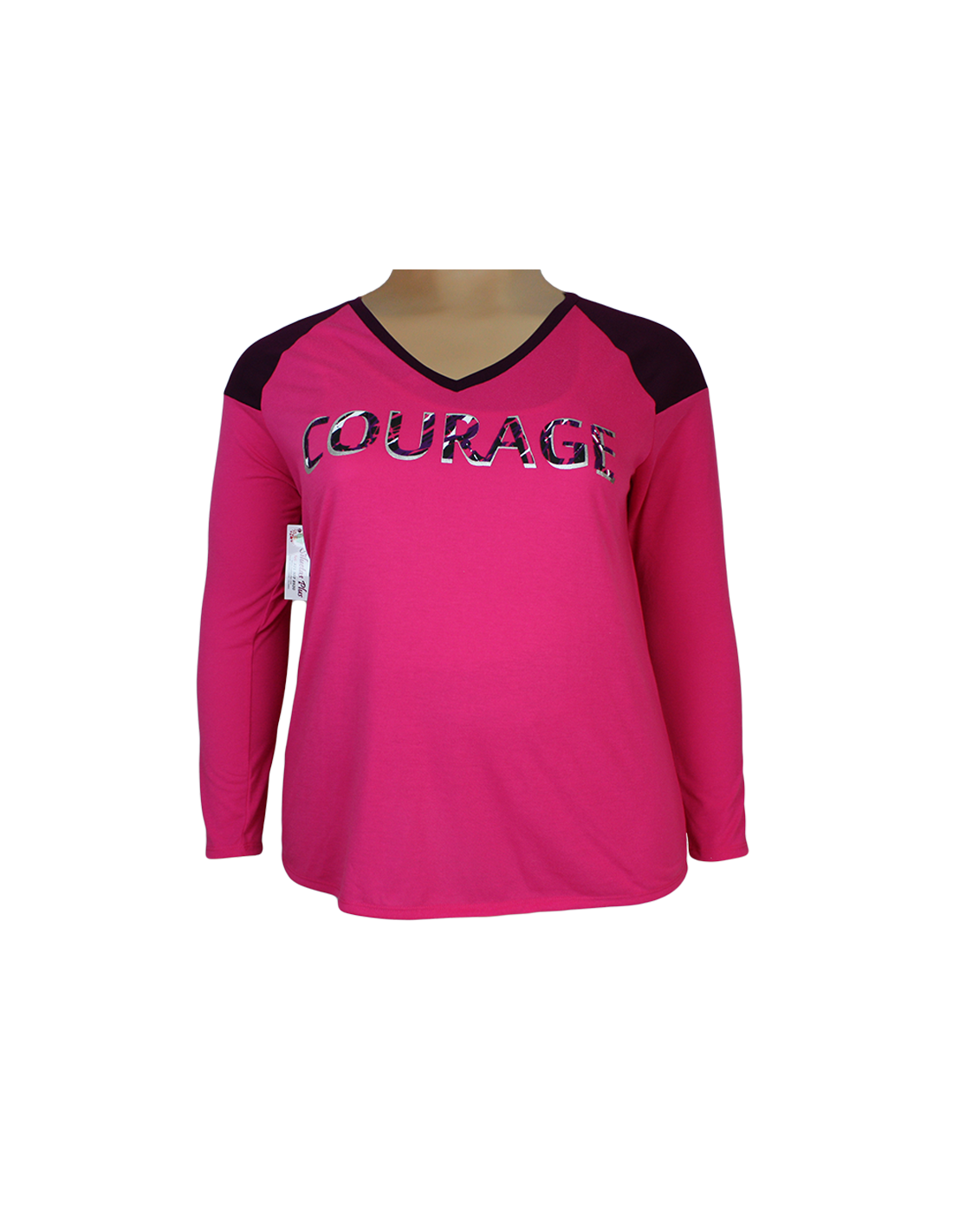 Lindo camibuso para mujer talla grande, gordita, marca ACTIVE, cuello en V, estampado "courage" con letra reflectora muy original, perfecto para hacer deporte y sentirte cómoda y segura al realizar tus actividades físicas. Diseñado para mujeres curvy y plus size. Luce toda la espontaneidad de tu figura con esta prenda de estilo moderno y exclusivo