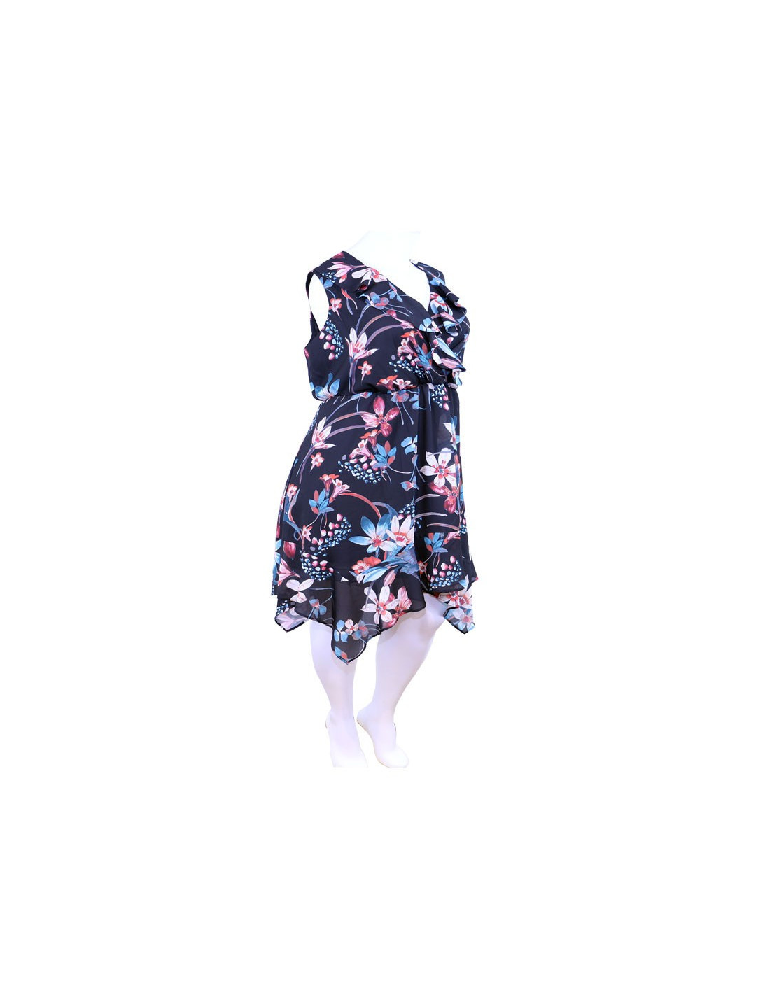 Hermoso vestido importado, marca Roz&Ali, confeccionado en nylon tipo seda, ajuste elastico a la cintura, sin mangas, escote en V cruzado, fondo negro con estampado floral en tonalidades rojas, blancas y azules. Forrado en nylon muy fresco para mayor comodidad. Dama tallas grandes, gorditas, vestido muy suave y vaporoso. Luce comoda y elegante en todas tus actividades. Moda Colombia.