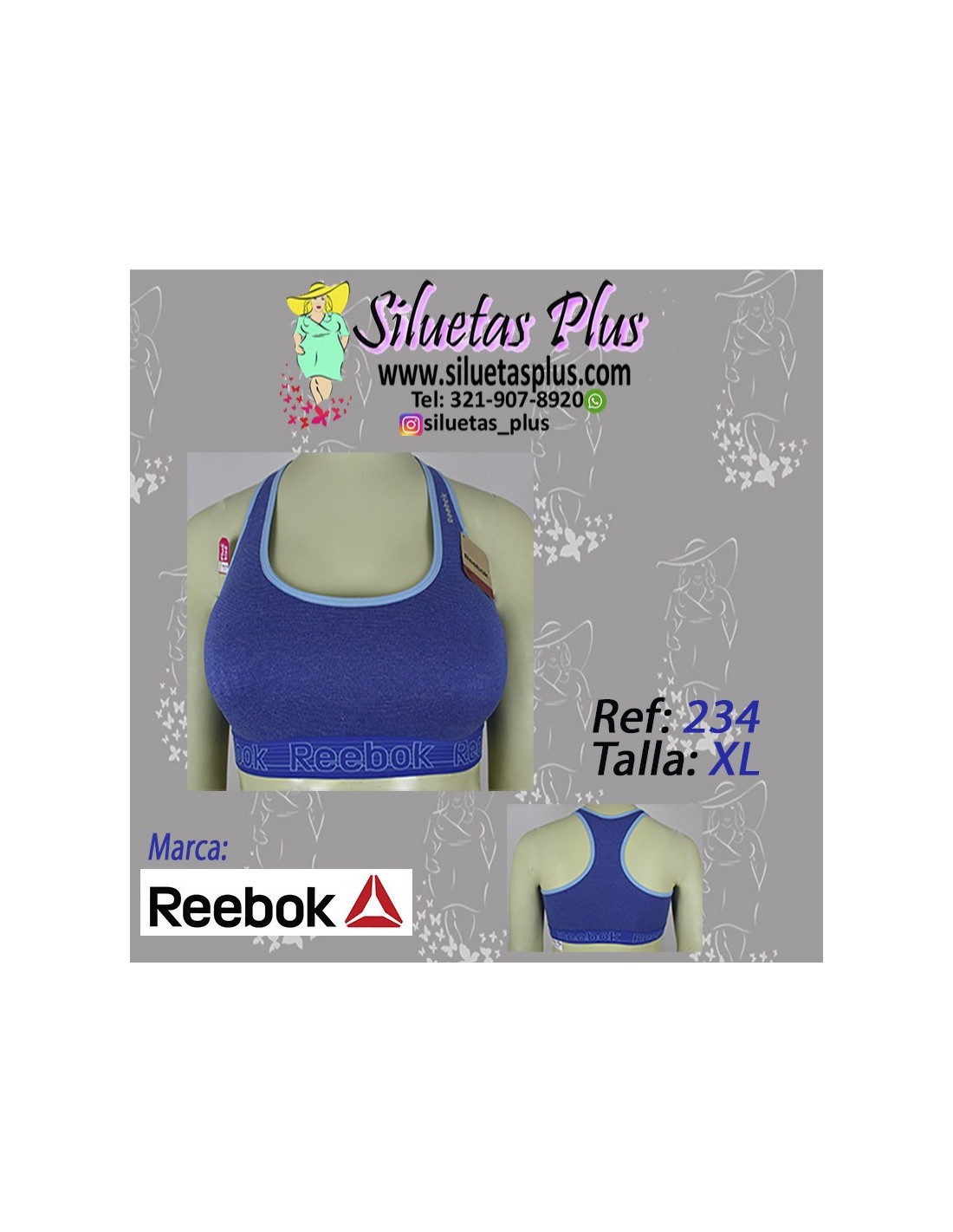 Precioso brasier tipo top deportivo para mujer talla grande, gordita, color azul, marca Reebok, cuello redondo y espalda en X , diseño de excelente calidad te ofrece confort y el soporte necesario para que hagas ejercicio u otras actividades con seguridad. Ideal para mujeres curvy y plus size luciendo juvenil y casual