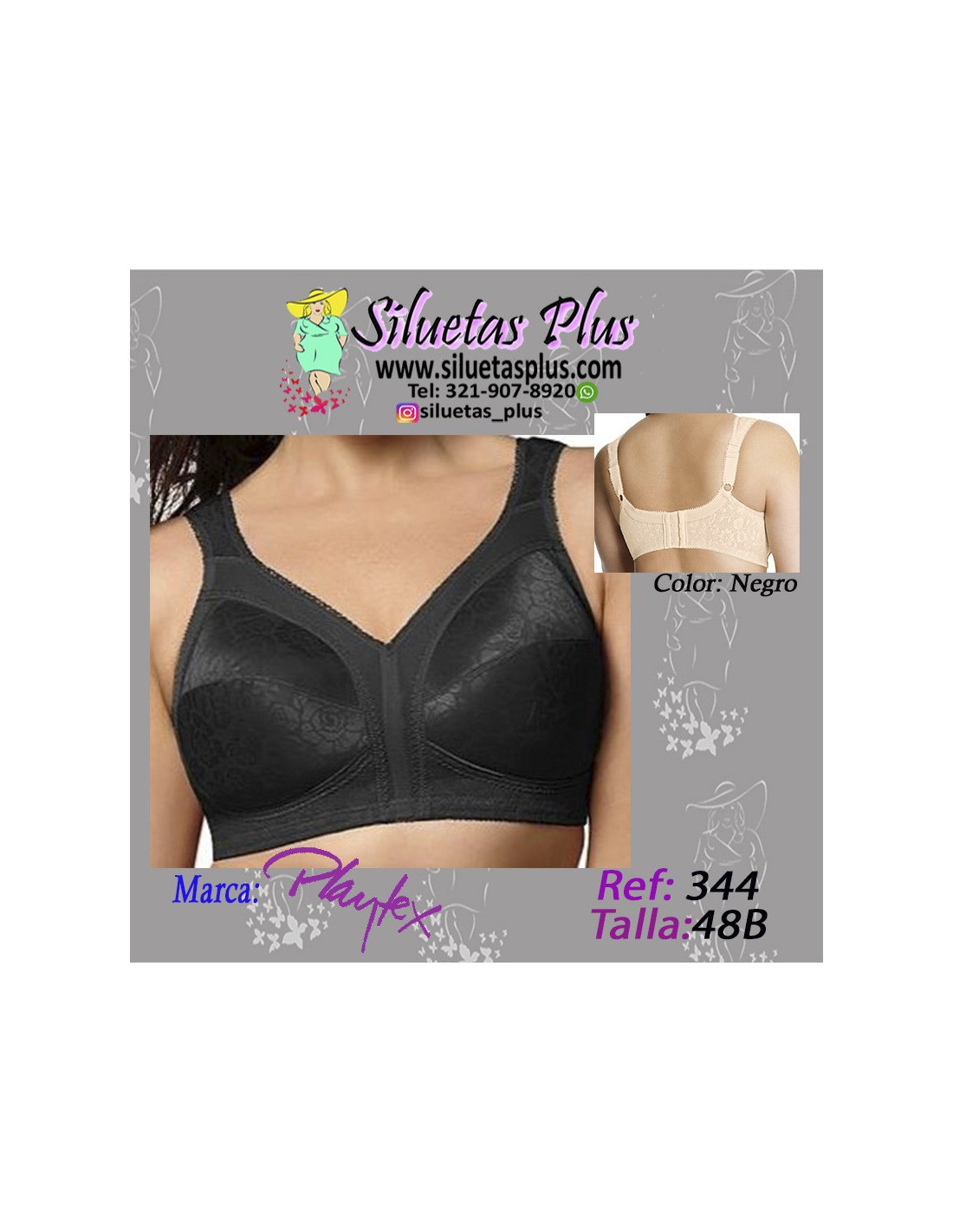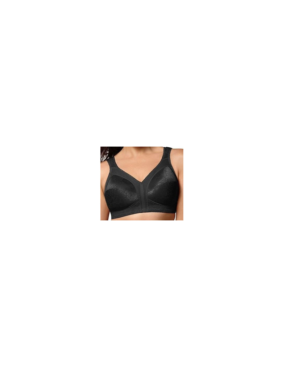 Hermoso brasier para mujeres talla grande, gordita, marca Playtex, sin varilla, copa brillante color negro, lindo diseño labrado de rosas y bandas gruesas que te brindan un ajuste perfecto dando gran comodidad y libertad en tus mejores momentos. Este hermoso diseño para mujeres curvy y plus size te hará lucir con mayor confort y seguridad tu busto, sin dejar de lado tu belleza natural.