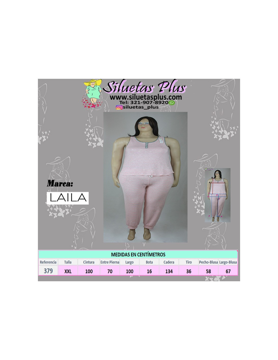 Hermosa pijama importada para mujeres talla grande, gorditas en Colombia, marca LAILA, pantalón y esqueleto color rosado-gris y borde gris, gracias a su silueta es perfecta para mujeres curvy y plus size y para dormir, te permite mover libremente mientras descansas, además de ser muy cómoda para tu cuerpo en toda la noche