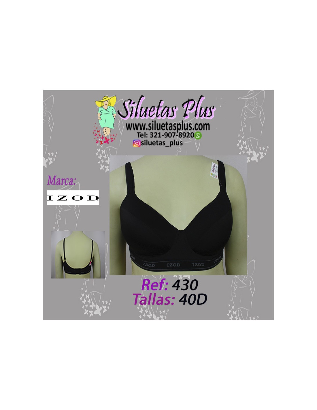 Precioso brasier para mujer talla grande, gordita, marca IZOD, color negro, varilla y copa dura, encaje en la mitad superior de la copa, bandas un poco gruesas para mayor resistencia y comodidad. Esta prenda es ideal para mujeres curvy y plus size en Colombia que desean reflejar un look moderno y femenino. Siéntete natural y segura con esta exclusiva prenda