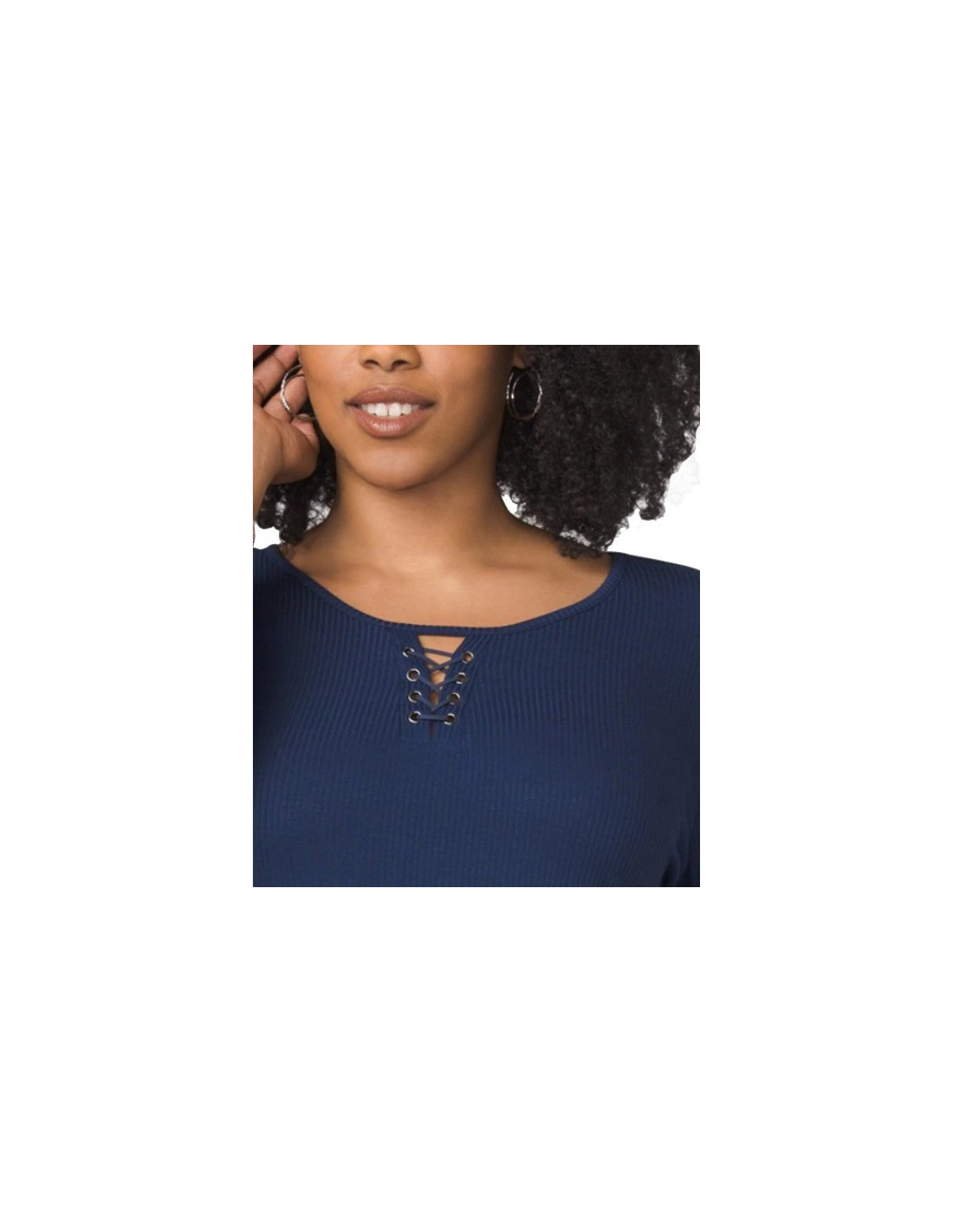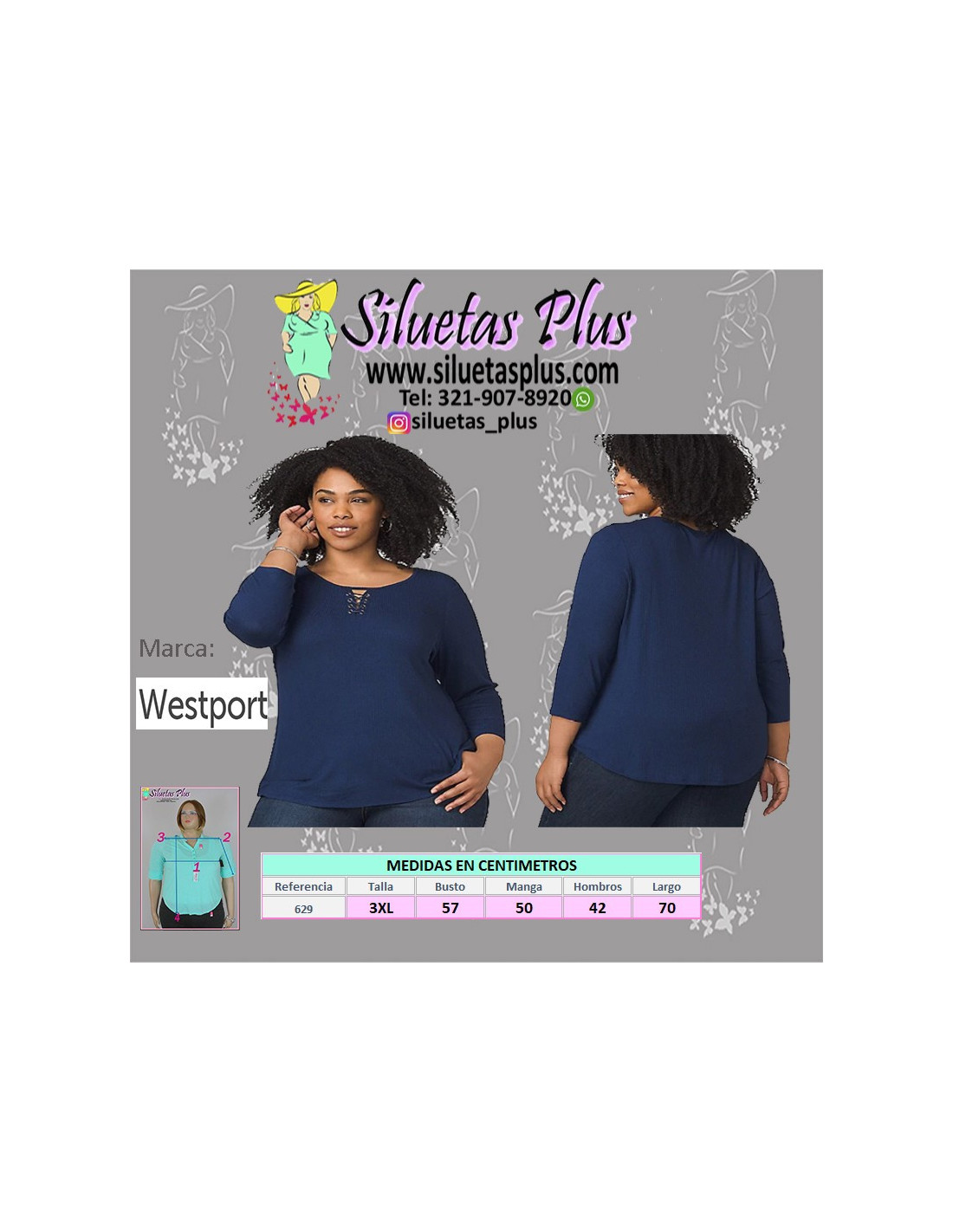Linda blusa para mujer talla grande, gordita, azul oscura, marca Westport que te brinda un look casual y muy femenino, tiene manga tres cuartos y un cordón en la zona del cuello. Su silueta semi-ajustada es perfecta para mujeres curvy y plus size, encantadoras que buscan un prenda cómoda y fresca para su figura femenina y sofisticada