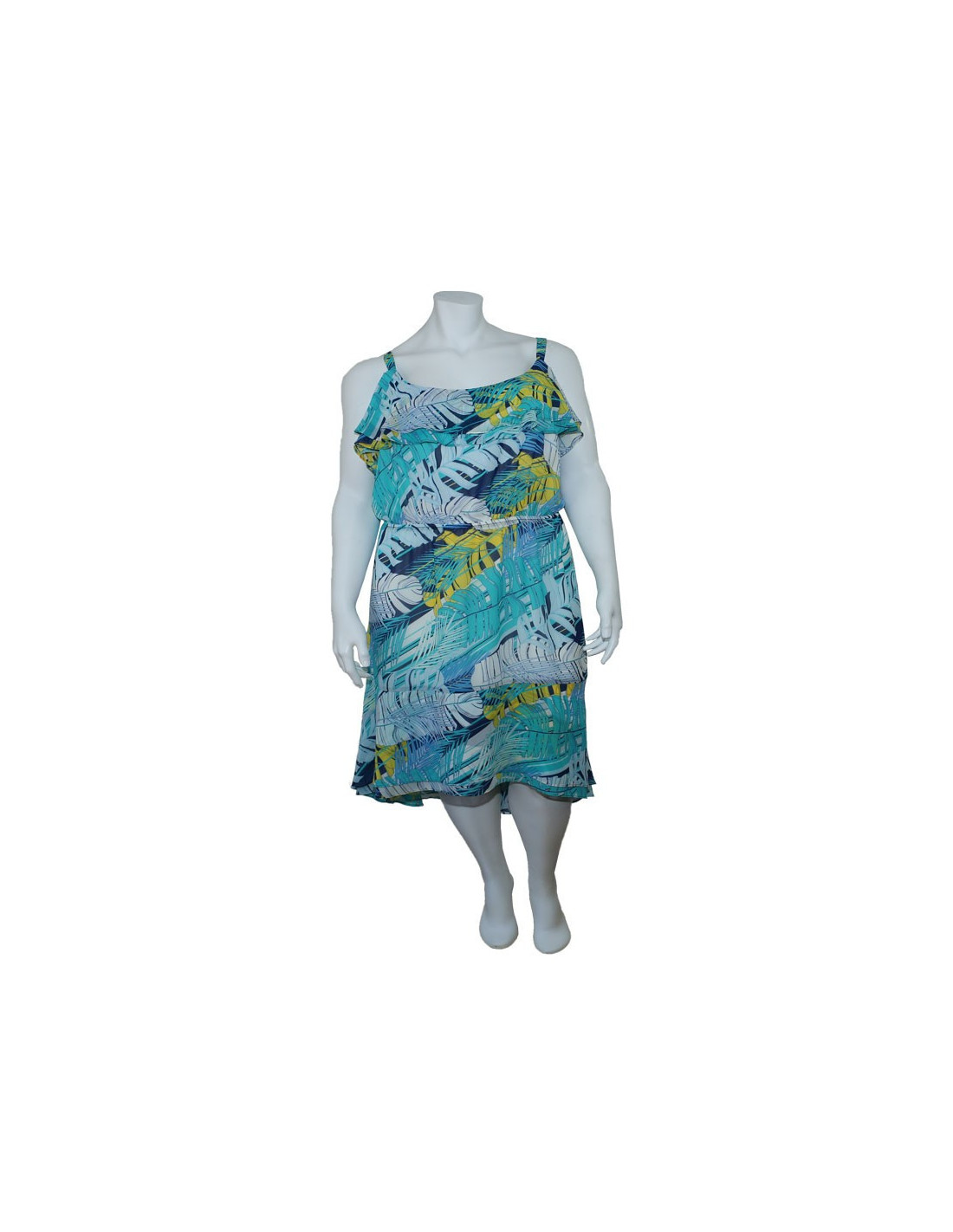 Hermoso vestido importado, marca Roz&Ali, confeccionado en chifon, sin mangas y escote redondo, ideal para climas calidos, estampado con hojas de palmeras en tonalidades azules oscuros, azul turquesa y amarillas. Forrado interior para mas frescura y comodidad. Dama tallas grandes, gorditas, vestido muy suave y vaporoso. Luce comoda y elegante en todas tus actividades. Moda Colombia.